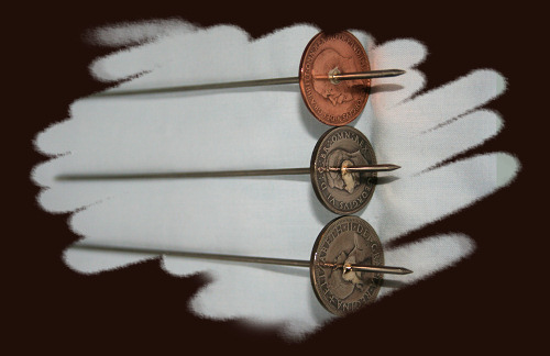 Made from British pre-decimal coins these offer not only a novel spindle but one that spins.